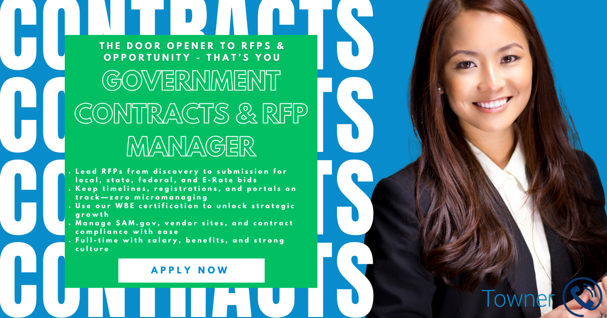 Looking for a Government Contracts Manager job in Kansas City? Towner is hiring a proactive, detail-driven leader to manage RFPs and government contracts across local, state, federal, and E-Rate levels. In this full-time role, you’ll lead bid strategy, navigate portals like SAM.gov, and drive compliance and growth. Ideal candidates understand public sector procurement and want to help scale a WBE-certified firm with purpose. Competitive salary, strong benefits, and a mission-driven team culture.